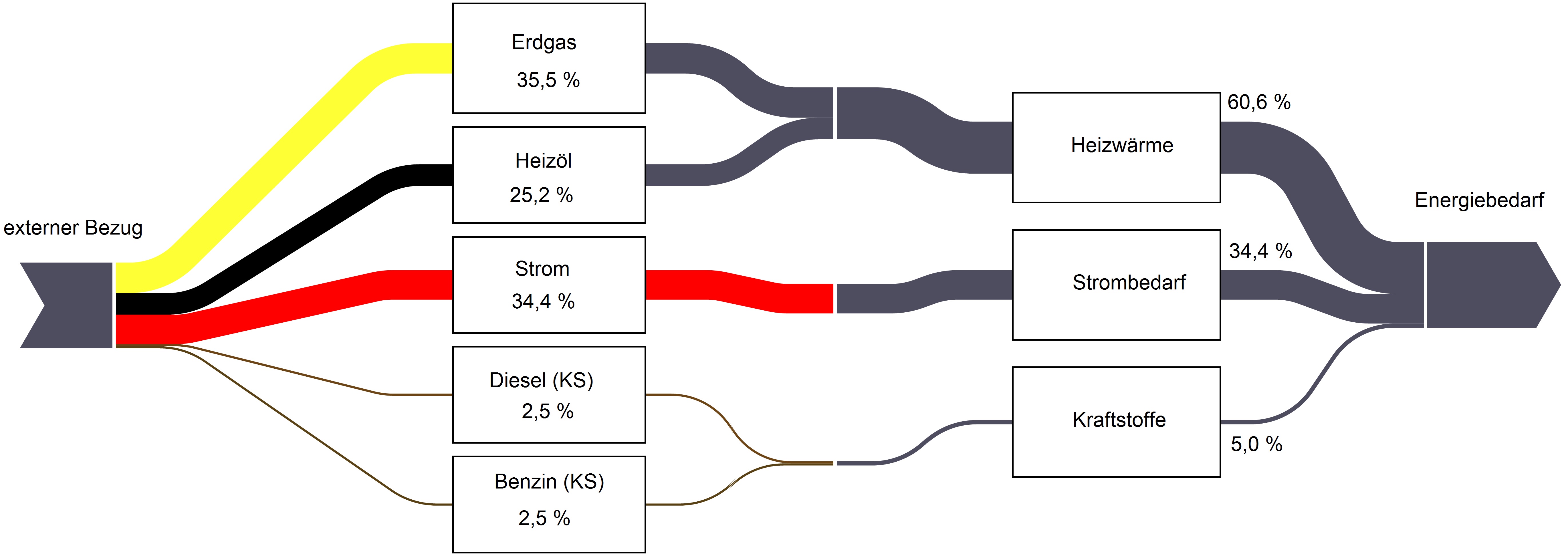 Die folgenden Grafiken zeigen die Energieaufteilung des Unternehmens bzw. des Standorts. Die erste Grafik zeigt die übergeordnete Energiebilanz für den Energiebezug (Gesamtunternehmen), die zweite Grafik die Verteilung der Energie auf die zum Einsatz kommenden Anlagengruppen (betrachteter Standort). Beide Darstellungen zeigen die Aufteilung nach Energiemengen (zum Vergrößern bitte Bild anklicken). Beide Grafiken haben die Energiekosten als Basis.