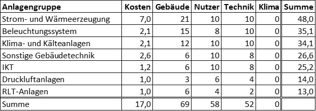 Die Wesentlichkeitsanalyse zeigt, dass das Gebäude, das Nutzerverhalten und mit Abstrichen die Technik einen großen Einfluss auf den Energiebedarf haben und diese Einflussgrößen für die Bereiche Strom- und Wärmeerzeugung betrachtet werden sollten. Die Anlagengruppen neben der Strom- und Wärmeerzeugung fallen von Ihrer Wesentlichkeit (deutlich) hinter diese ab, so dass hier eine untergeordnete Wesentlichkeit besteht, was dazu führt, dass eine Betrachtung hinsichtlich Effizienzen nachgelagert erfolgen sollte, sobald die Maßnahmen mit Bezug zur Strom- und Wärmeerzeugung definiert / umgesetzt sind (zum Vergrößern bitte Tabelle anklicken).