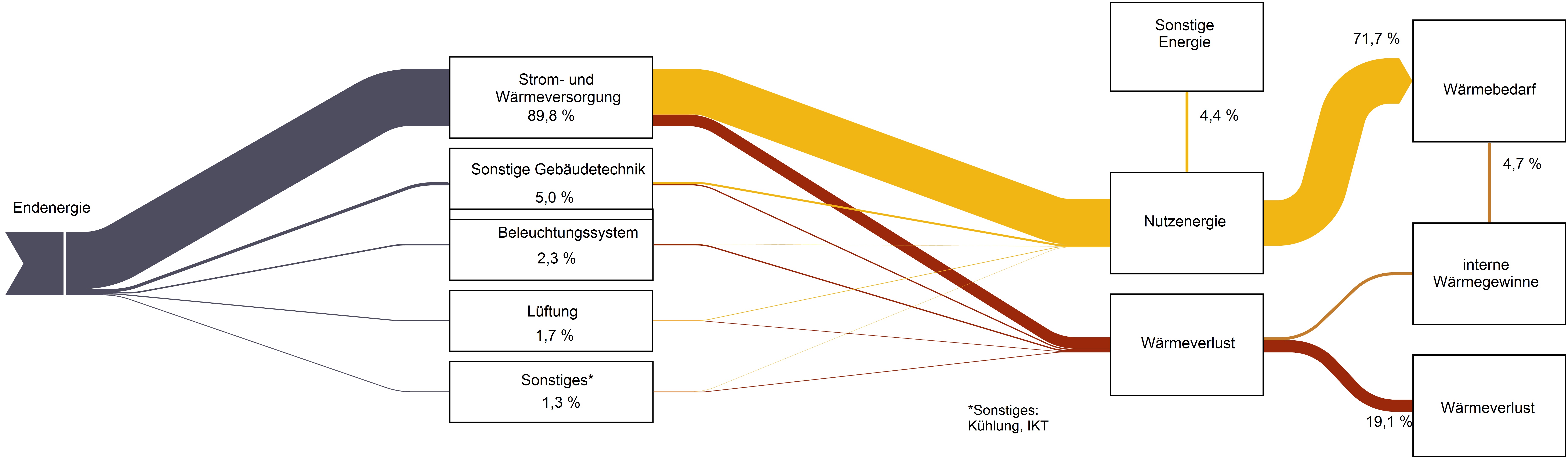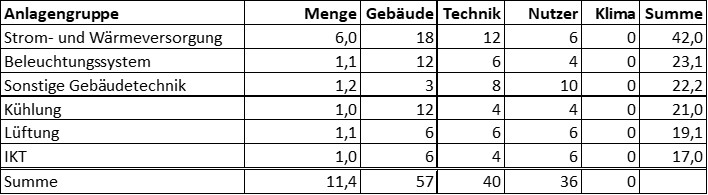 Die Wesentlichkeitsanalyse zeigt, dass (wie zu erwarten) das Gebäude und die eingesetzte Gebäudetechnik die größten Potenziale für eine Reduzierung des Energiebedarfs boten (zum Vergrößern bitte Tabelle anklicken).