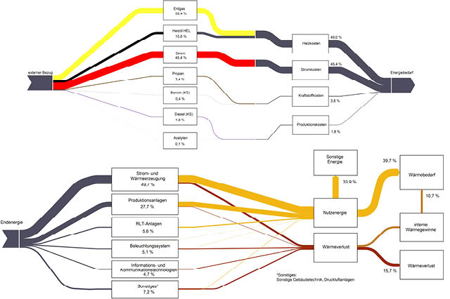 Die folgende Grafik zeigt die Energieaufteilung der Organisation über sämtliche, betrachteten Standorte auf die zum Einsatz kommenden Anlagengruppen. Die Darstellung zeigt die Aufteilung nach Energiemengen (zum Vergrößern bitte Bild anklicken).