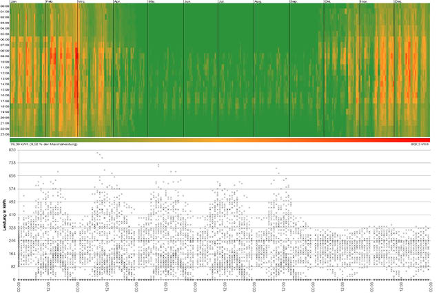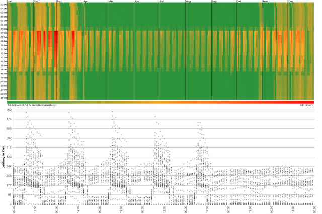Vor allem bei der Analyse der Erdgaslastgänge zeigte sich, dass noch einmal geprüft werden sollte, welcher Zähler zu welchem Abnehmer gehört. So soll der mittlere Lastgang zu einem Ofen gehören - das Profil deutet aber eher auf eine Gebäudeheizung hin.